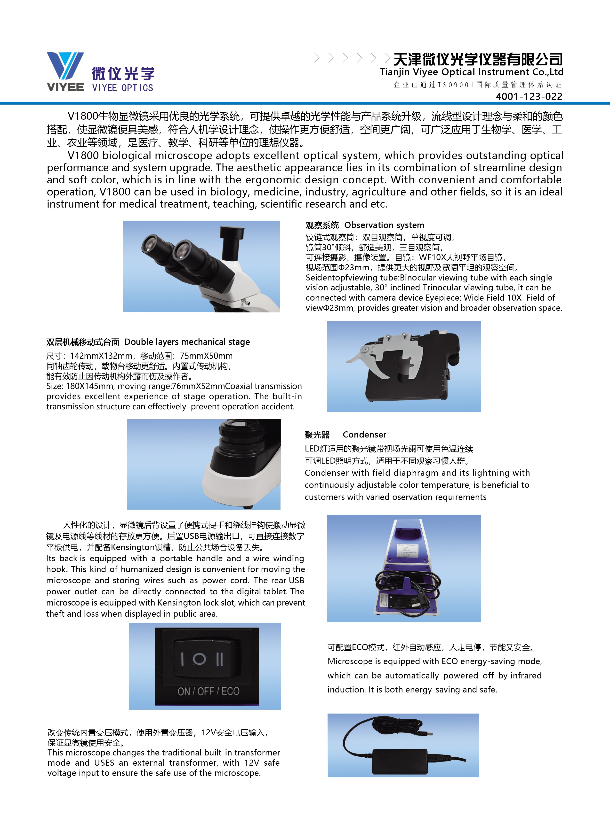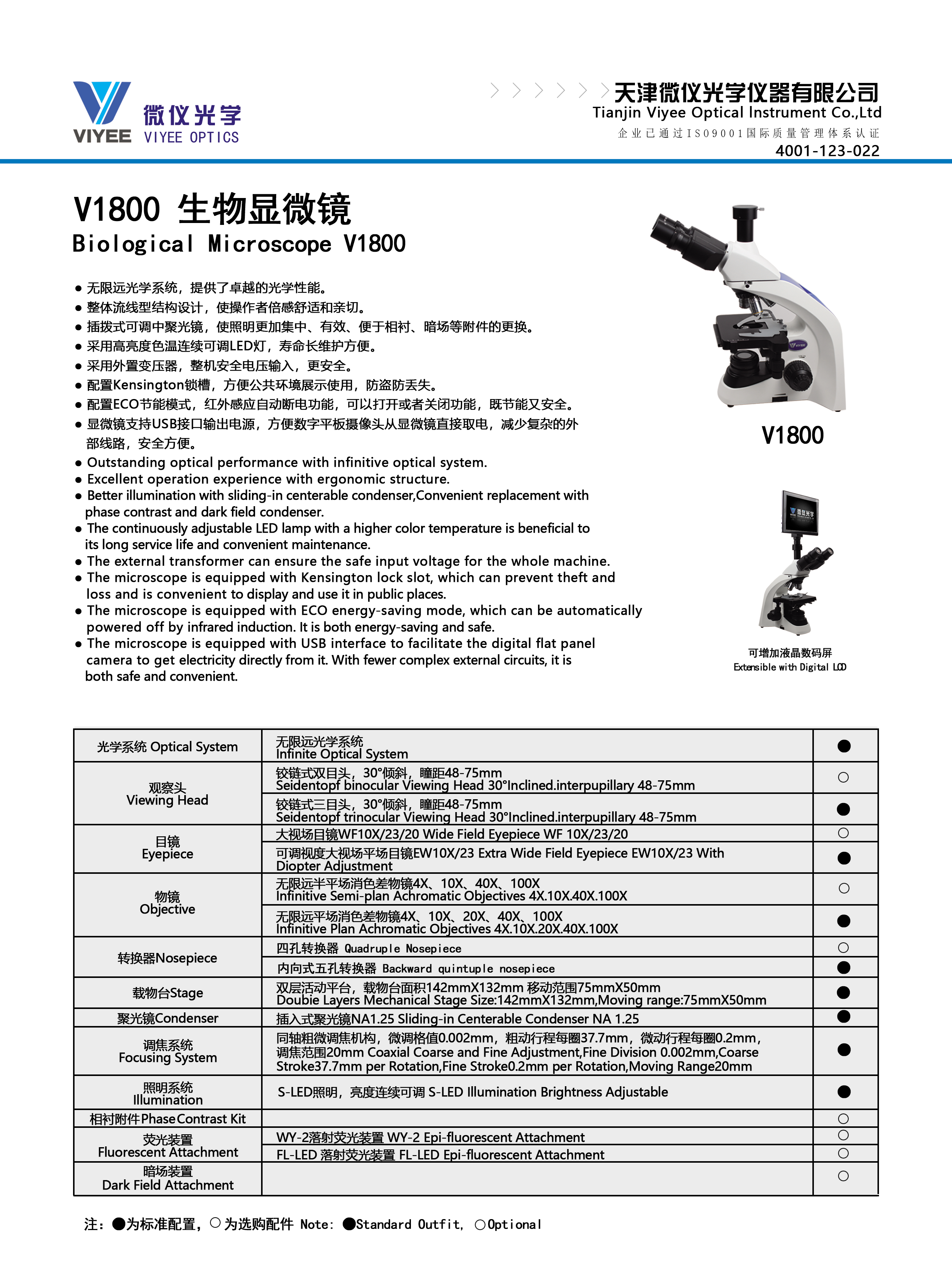 感謝您一直以來對我們天津微儀光學儀器有限公司的信任支持與厚愛,我公司本著質量**,客戶至上的精神,多年來為國內外用戶提供高質量的產品和服務,獲得了廣大用戶的認可。經公司研究決定,即日起,我公司生產的產品名稱:三目生物顯微鏡,型號:WYS-08C已進行全面升級,升級后的產品為名稱:三目生物顯微鏡,型號:V1800,新產品主要針對以下功能進行優化: